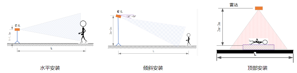 該雷達模塊的建議安裝方法包括水平安裝,傾斜安裝和頂部安裝。