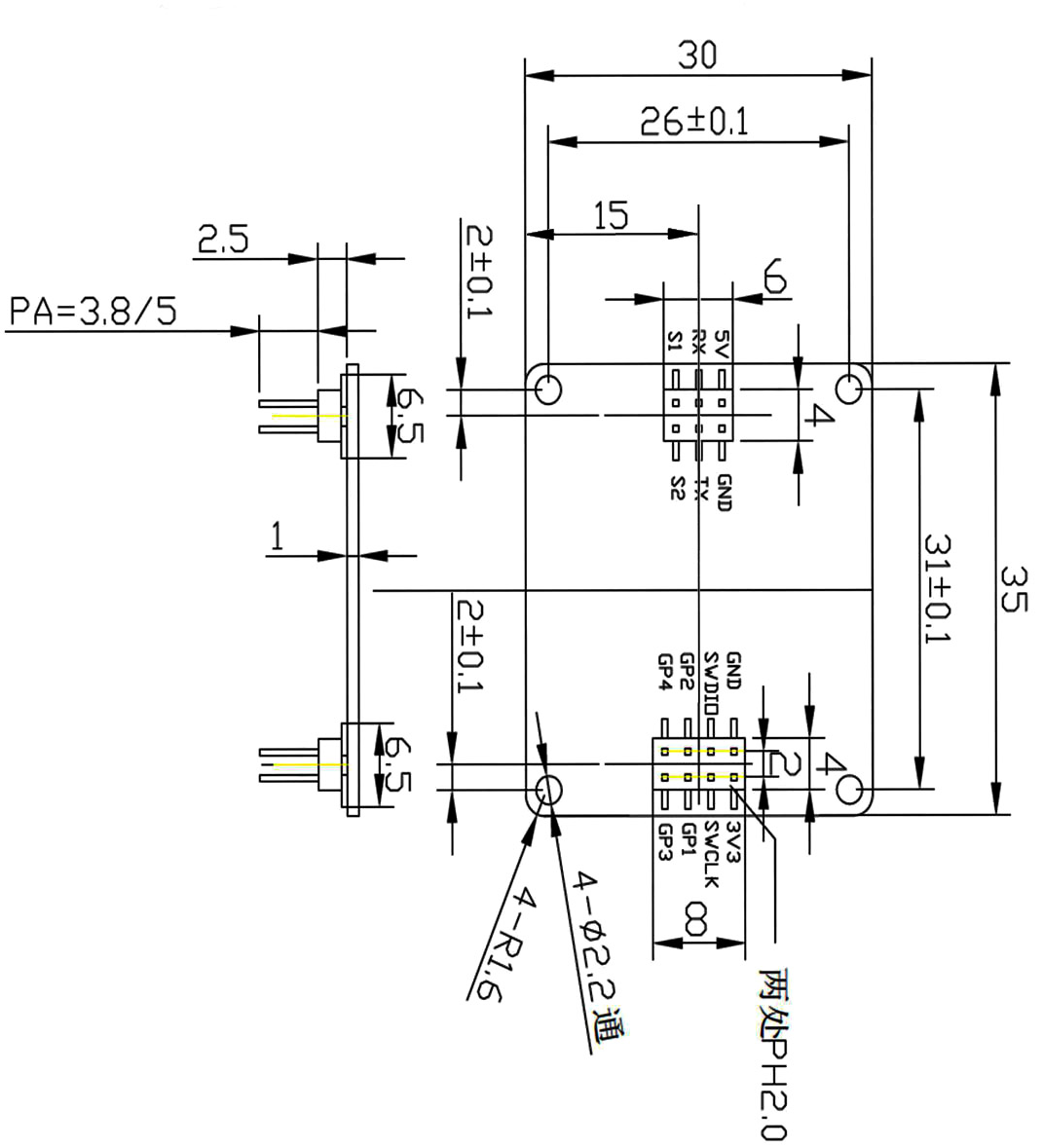 接口二: 1号和2号引腳是電源輸出3.3V,和地端