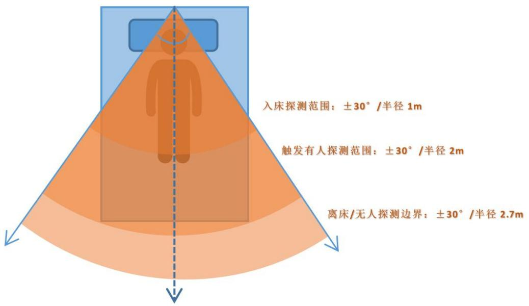 雷達傾斜安裝,傾斜角度爲 45°,安裝在床頭上方,雷達安裝高度建議爲高于床面(miàn)0.8m-1.2m; 保證雷達主波束覆蓋探測區域。受雷達安裝高度及雷達波束範圍影響,在該安裝模式下,觸發(fā) 2.7米;人體呼吸頻率檢測最大距離1.5米(注:本數據僅作爲參考數據,實際探測距離與參考數 據會(huì)存在±0.5m的誤差)。